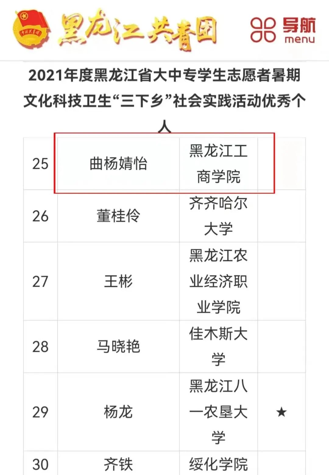 近日,團省委對全省2021年暑期“三下鄉(xiāng)”社會實踐活動進行了總結,表彰了在2021年暑期“三下鄉(xiāng)”社會實踐活動中表現優(yōu)秀、成績突出的集體和個人。經過學校推薦、團省委評審等環(huán)節(jié),我校曲楊婧怡同學榮獲2021年度黑龍江省大中專學生志愿者暑期文化科技衛(wèi)生“三下鄉(xiāng)”社會實踐活動優(yōu)秀個人。