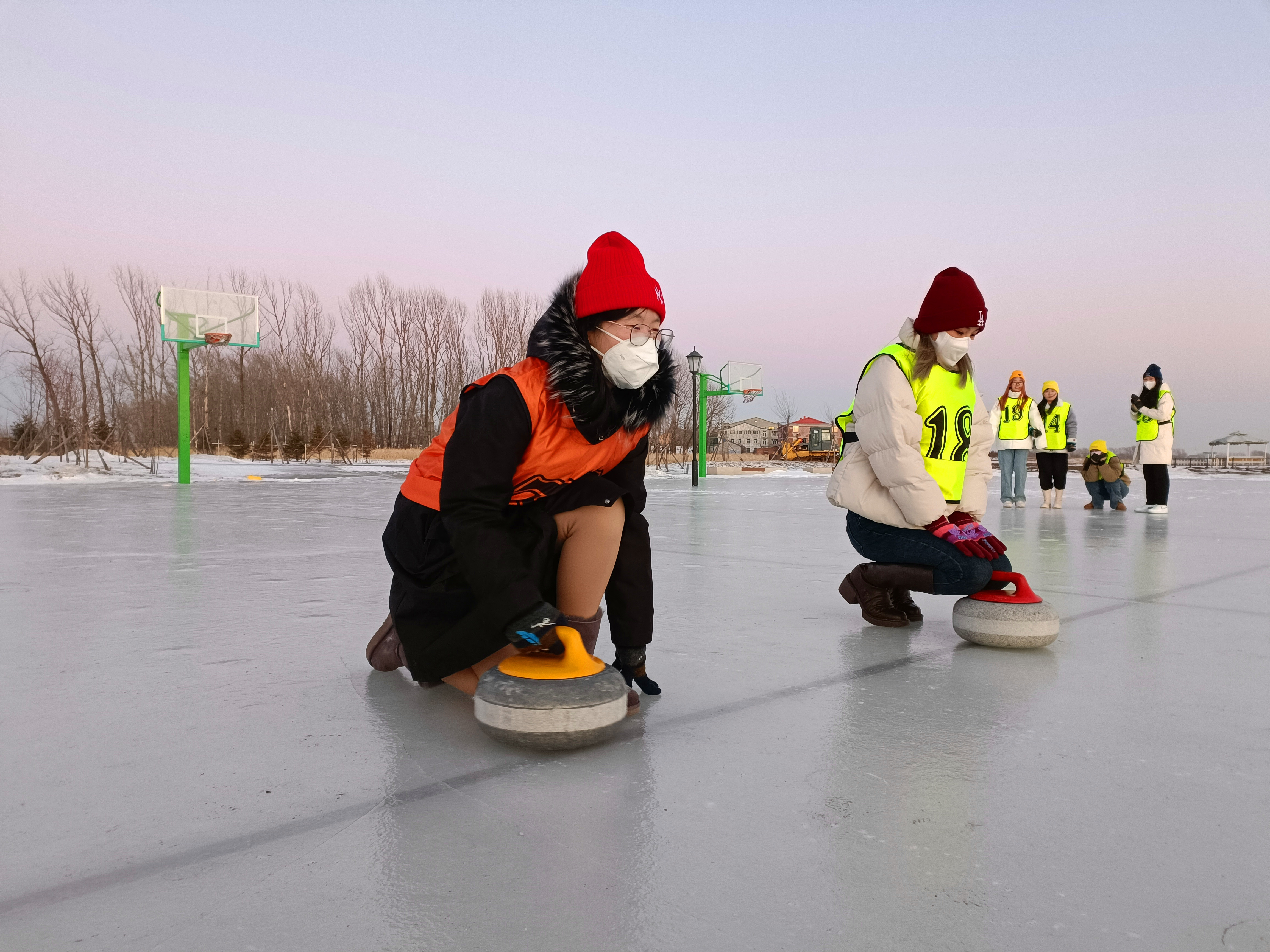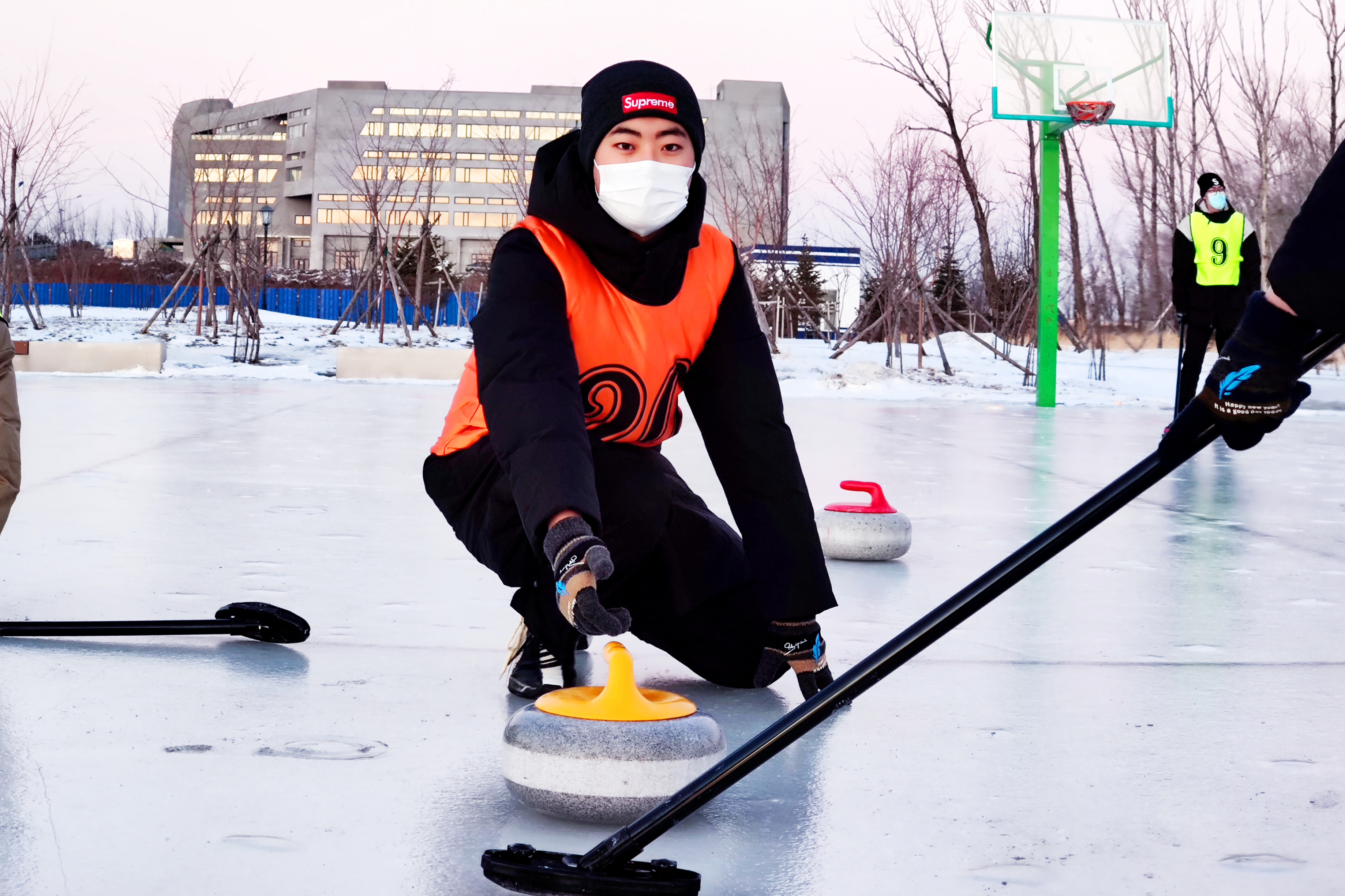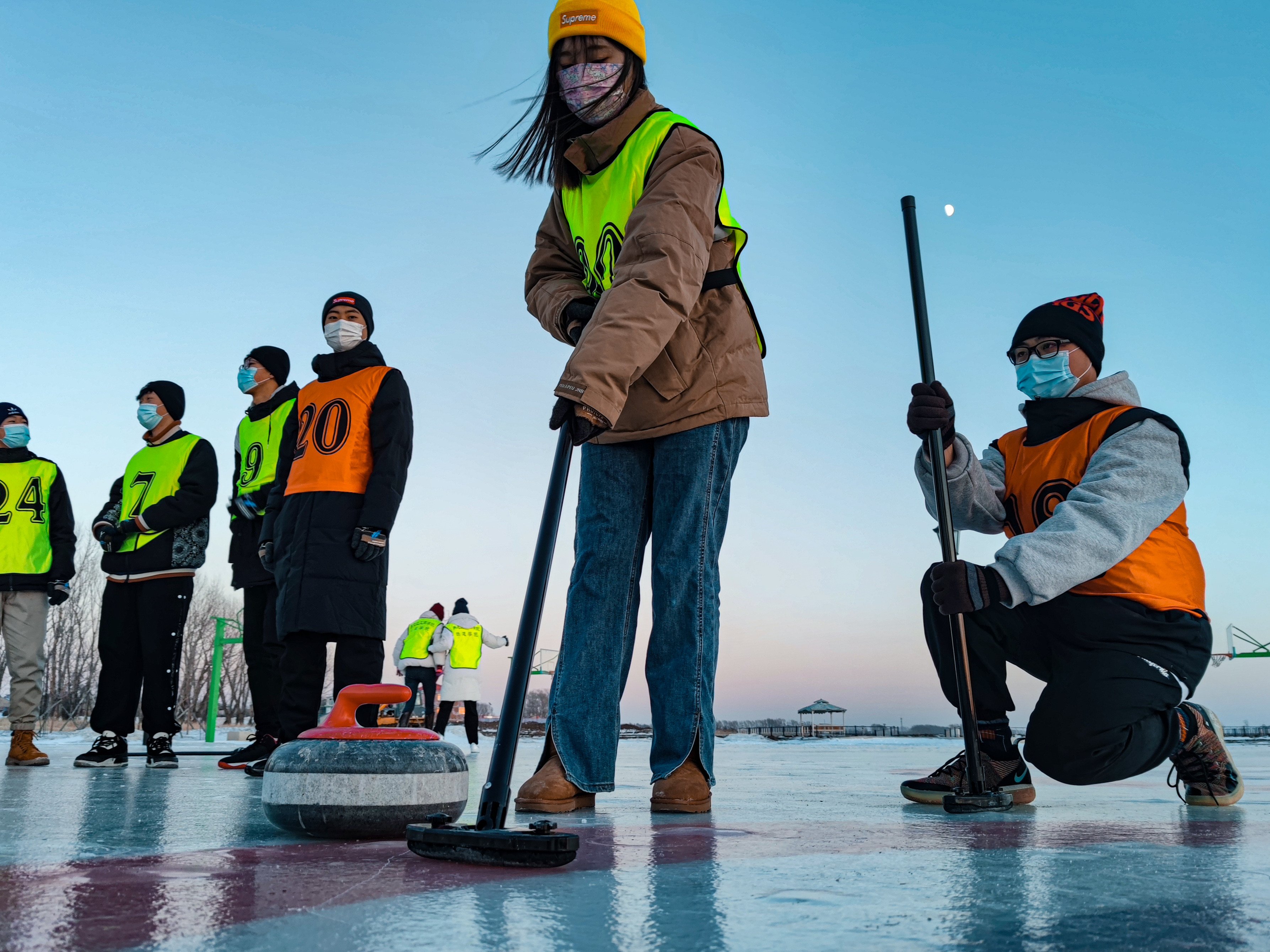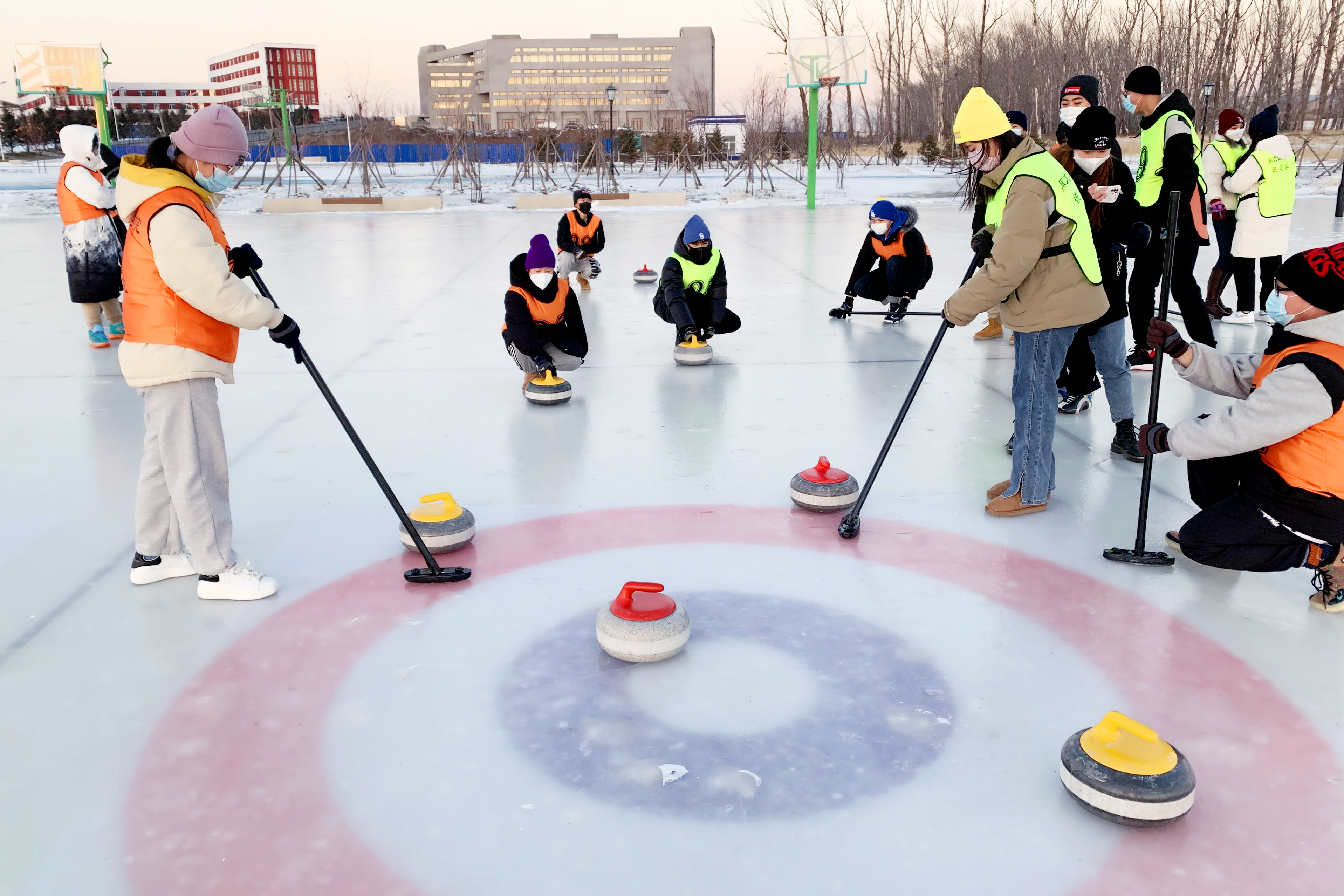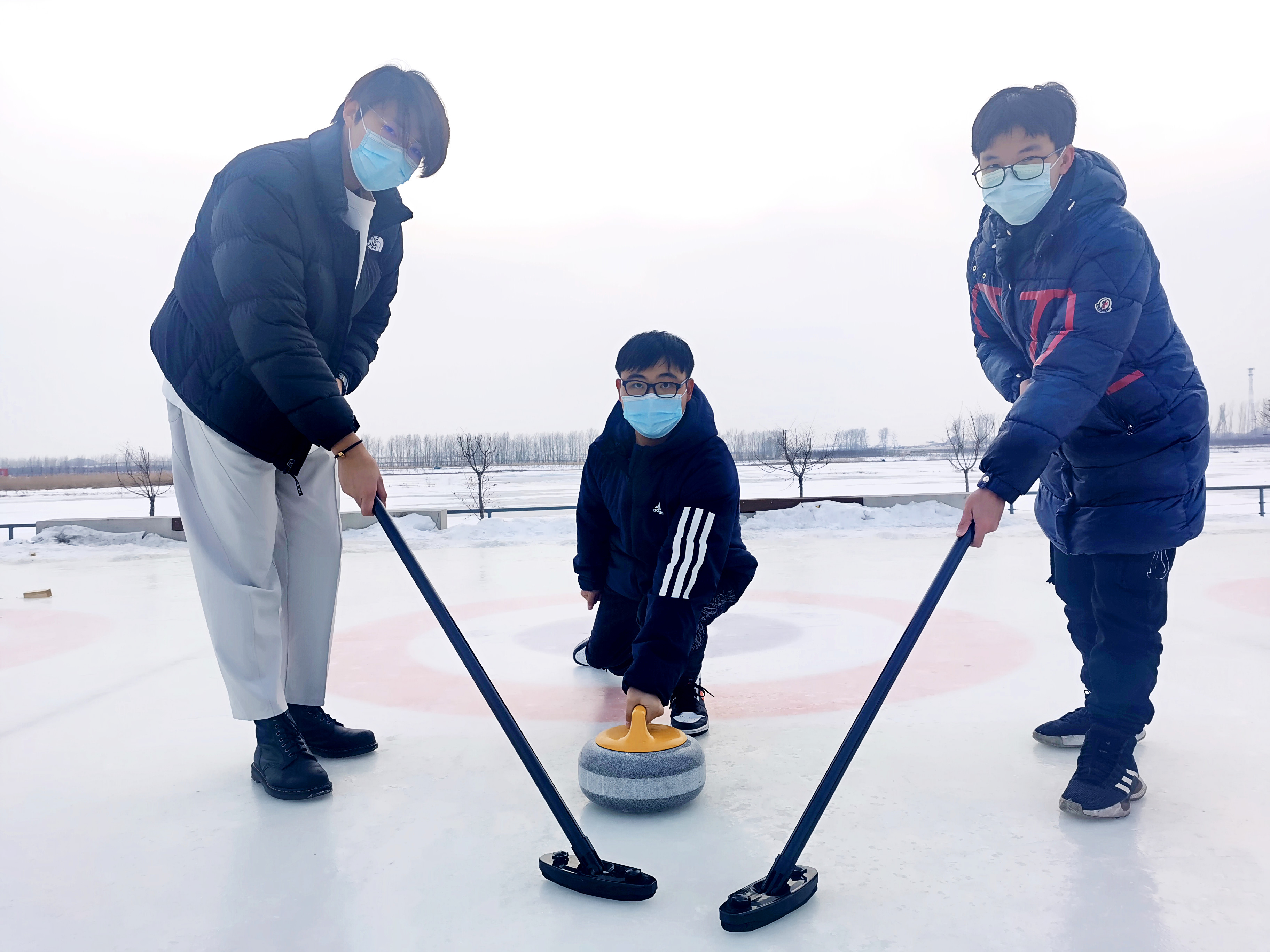 注:舒鑫(中間擲冰壺者)參加冰壺運動
