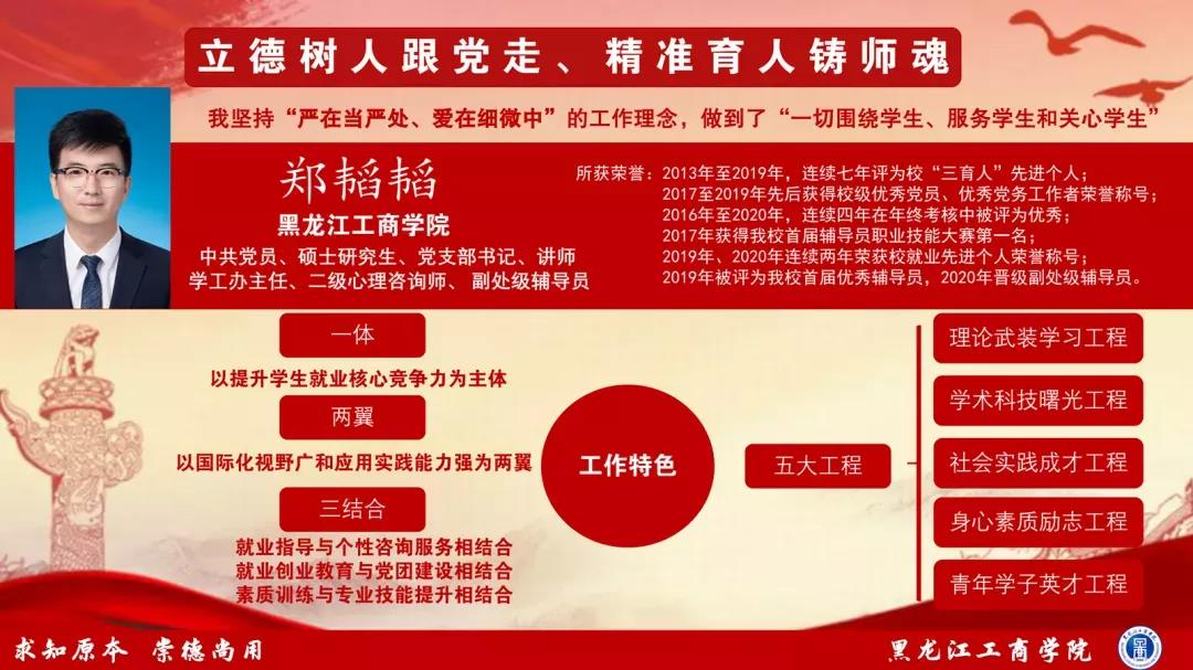 圖說:我校經濟與貿易學院副處級輔導員鄭韜韜在第十三屆“黑龍江省高校輔導員年度人物”暨2021年“龍江最美高校輔導員”評選中,喜獲“黑龍江省高校輔導員年度人物提名獎”榮譽稱號。
