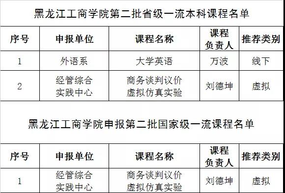 圖說:在省教育廳組織的第二批一流本科課程評選中,我校推薦的大學英語、商務談判議價虛擬仿真實驗兩門課程被認定為第二批黑龍江省一流本科課程。其中,線下一流本科課程一門、虛擬仿真實驗教學一流課程一門。商務談判議價虛擬仿真實驗被黑龍江省教育廳推薦申報第二批國家一流課程。目前,我校已具有4門省級一流課程。